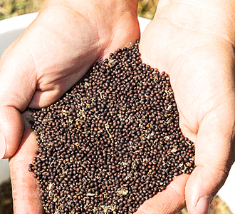 Damit unsere Salbei zu einer starken Pflanze heranwächst und ihre ganze Kraft entfalten kann, braucht sie neben einem guten Boden, Licht und Wasser noch mehr: viel Platz zum Wachsen. Im heimischen Beet oder Pflanztopf würde man eine Jungpflanze pikieren, also mit äußerster Vorsicht auseinandersetzen, sobald sie die ersten Blättchen bildet. Weil wir das Saatgut in gleichmäßig großem Abstand mit einer Einzelkornaussaatmaschine ausbringen, haben unsere Jungpflanzen bereits von Anfang an genug Platz zum Wachsen. Auch Unkräuter stören sie dabei nicht, denn das fleißige Team unserer Feldbauern kümmert sich emsig darum, dass der Salbei kein Unkraut im Weg steht.