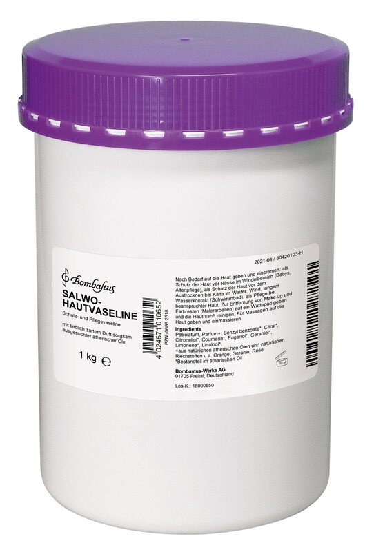 Weiche Vaseline mit lieblich zartem Duft sorgsam ausgesuchter ätherischer Öle. Salwo-Hautvaseline schützt die Haut bei Kälte im Winter, starkem Wind oder langem Wasserkontakt (Schwimmbad) vor dem Austrocknen. Nach kreativen und handwerklichen Arbeiten mit Farben, Lösungsmitteln, Mörtel oder Gips pflegt Salwo-Hautvaseline die Haut spürbar und gibt ihr ein zartes Aussehen.